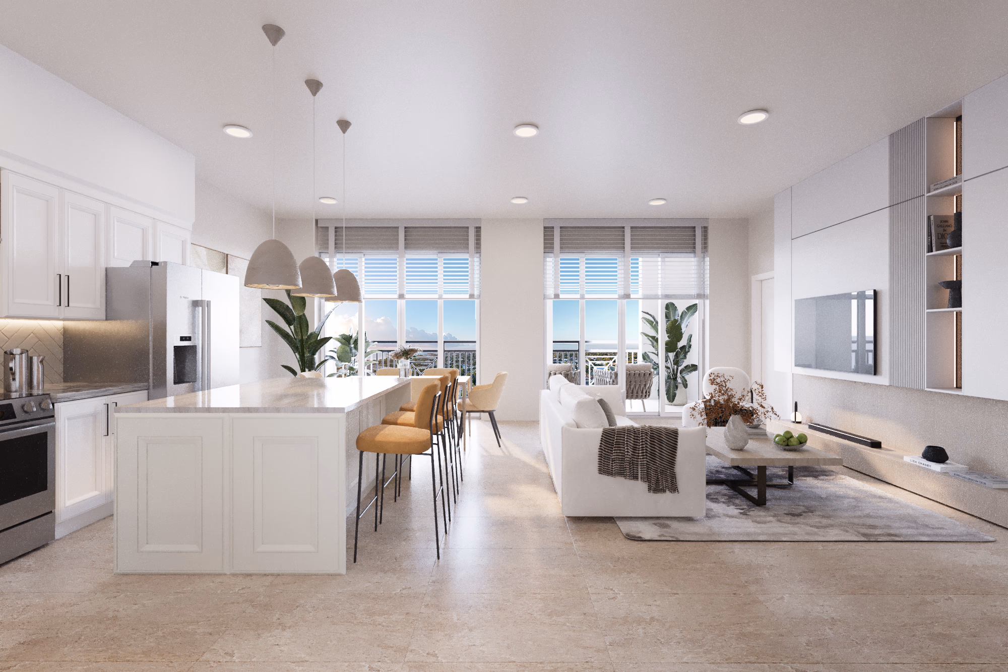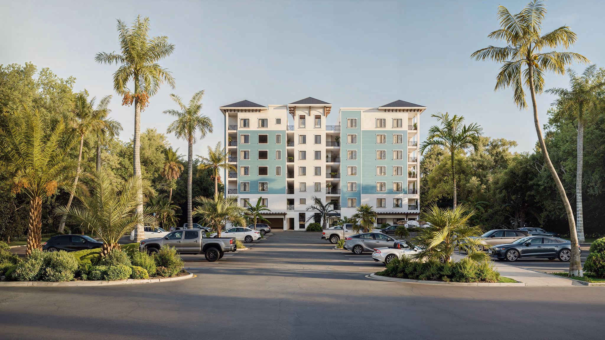 The Trident Residence is a mixed-use, commercial and residential complex located in Satellite Beach, Florida’s commercial district along A1A. The development offers views of the Atlantic Ocean and features three commercial spaces on the east side of the ground floor, along with two lobbies, a parking garage, a gym, and a pool. Floors 2 through 6 contain a combination of 2 and 3-bedroom units, all designed in the same layout. The 7th floor includes a selection of penthouse units, a club room, and a storage area. The building is designed in the British West Indies architectural style, showcasing a pitched roof, Bahama shutters, and lap siding.